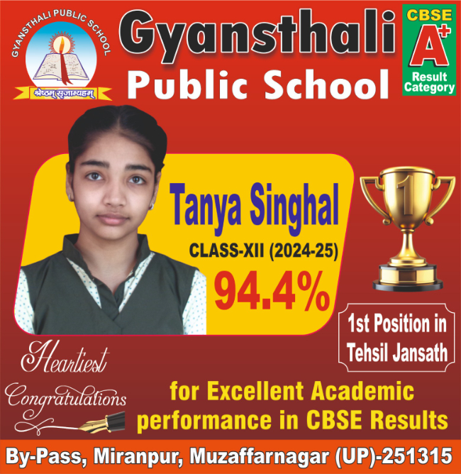 Tania Singhal secured 94.4% marks, earning the first position not only in the school but also in the entire Jansath Tehsil region. Jayant Chaudhary stood second with 91.6% marks. Meanwhile, Vrinda Gupta, Anshika Panwar, and Dhruv Gupta shared the third position, each scoring 90.6%.